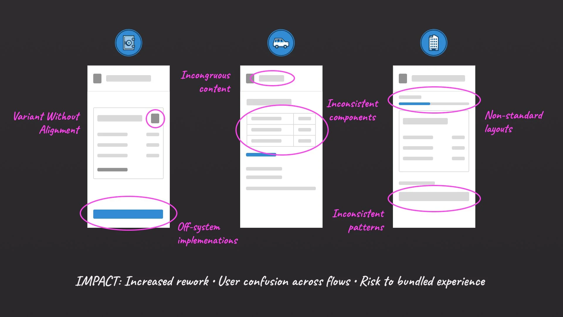 Inconsistent patterns emerged across products (e.g., information display, status messaging, entry and exit interactions)